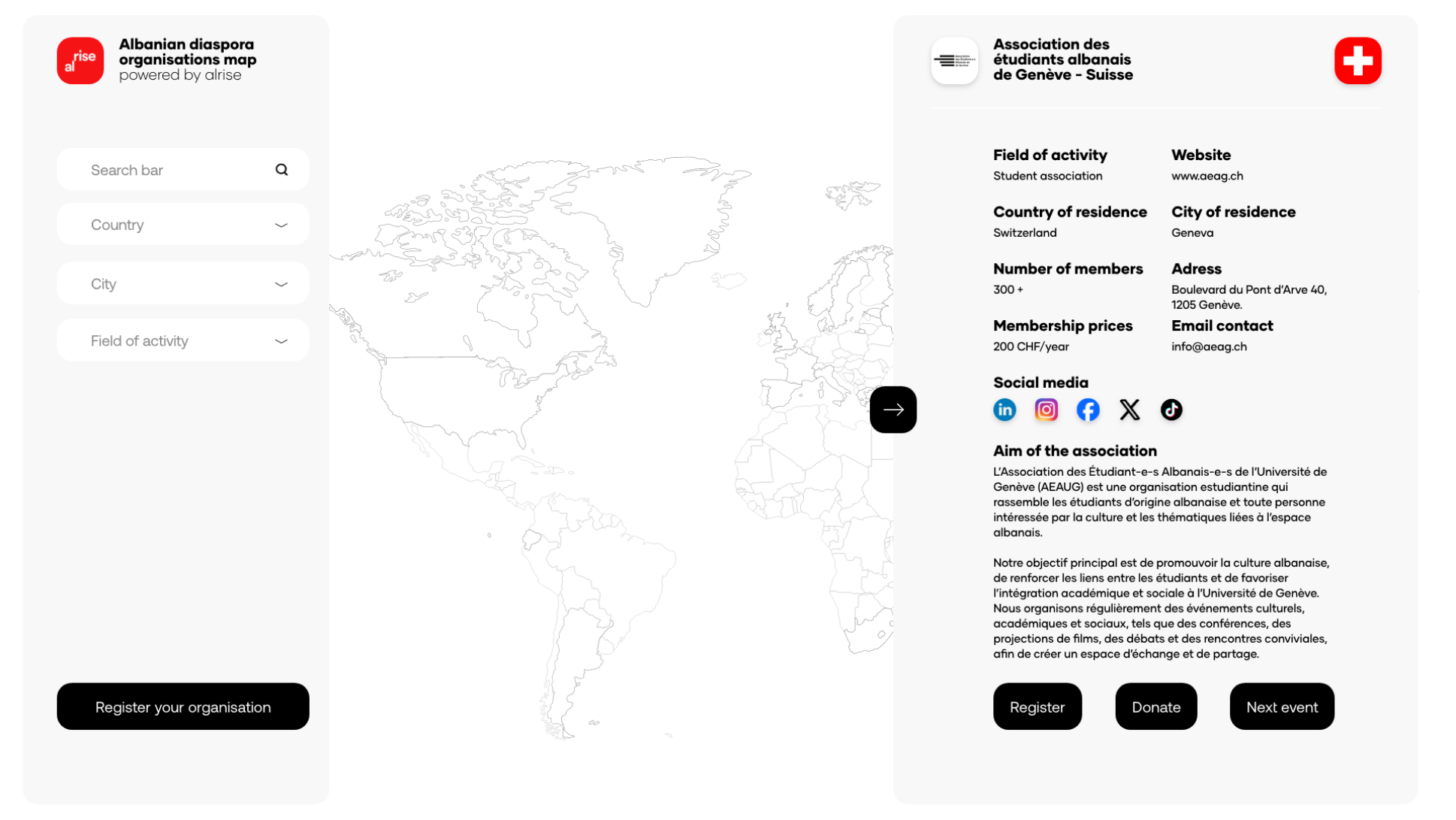 Our first platform enables you to explore a global directory of Albanian organizations, categorized by country, city, and area of activity.